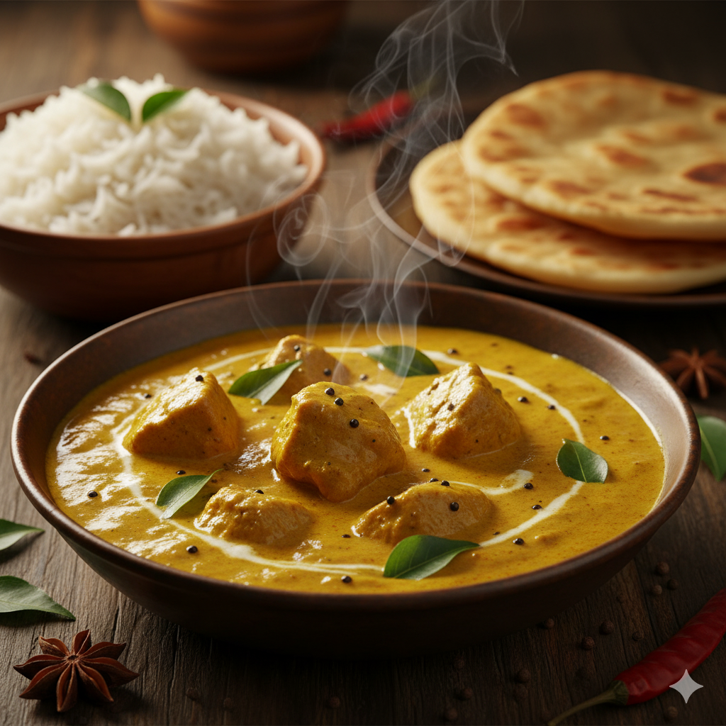 Goat cooked in traditional madras curry, flavoured with fresh curry leaves, mustard